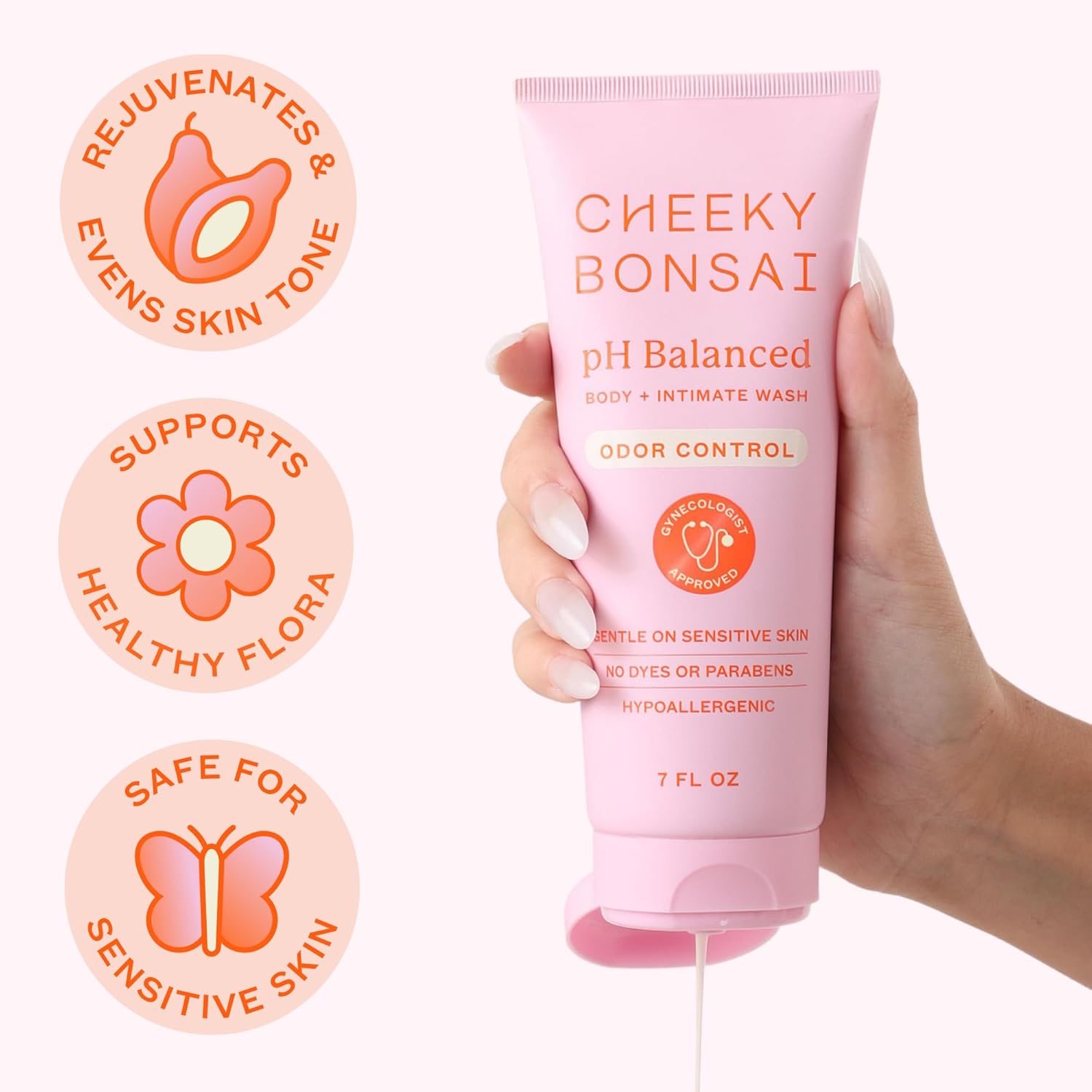GENTLE BODY & INTIMATE CLEANSER: Cheeky Bonsai’s pH balanced wash for body and intimate skin removes odor-causing bacteria.